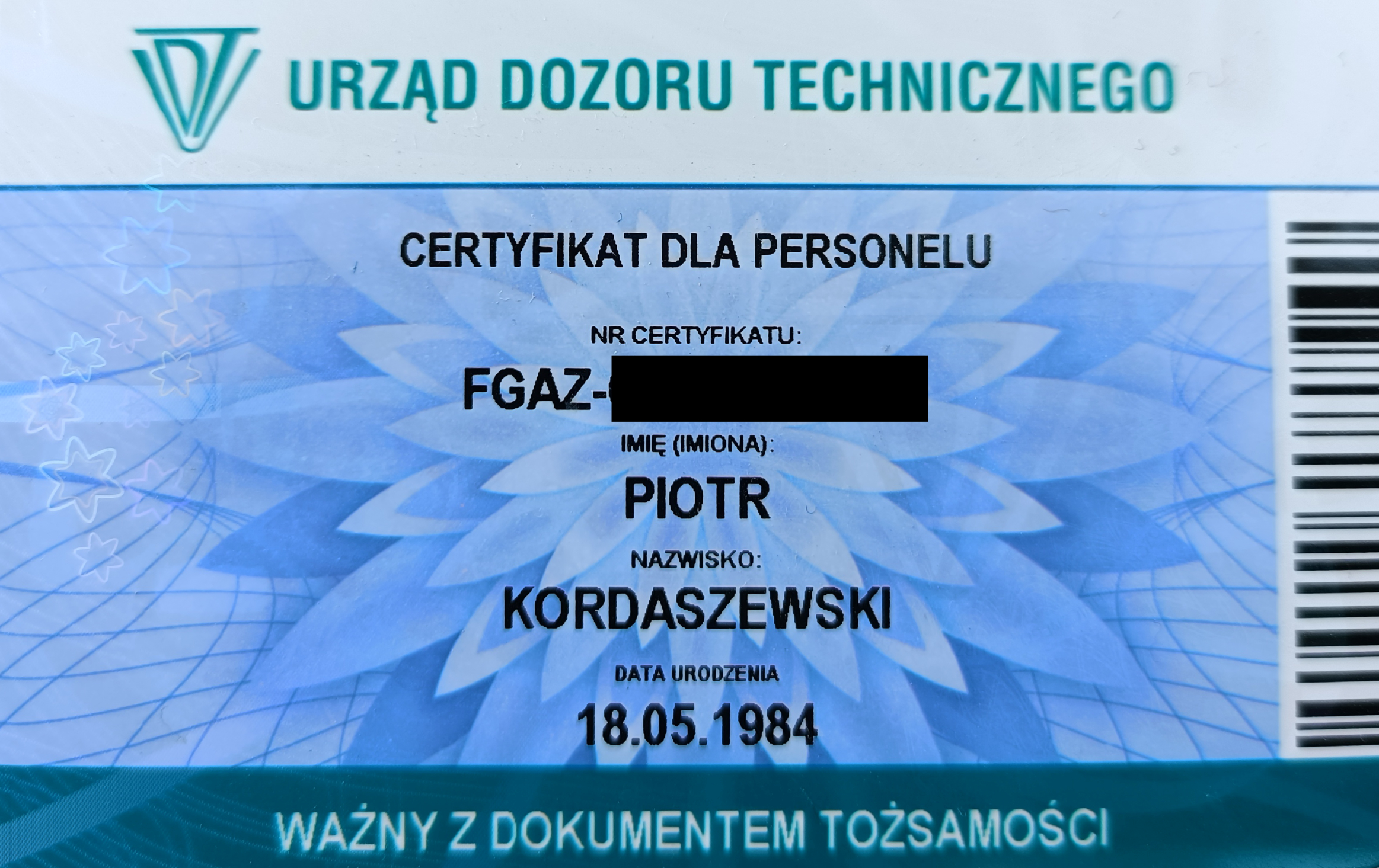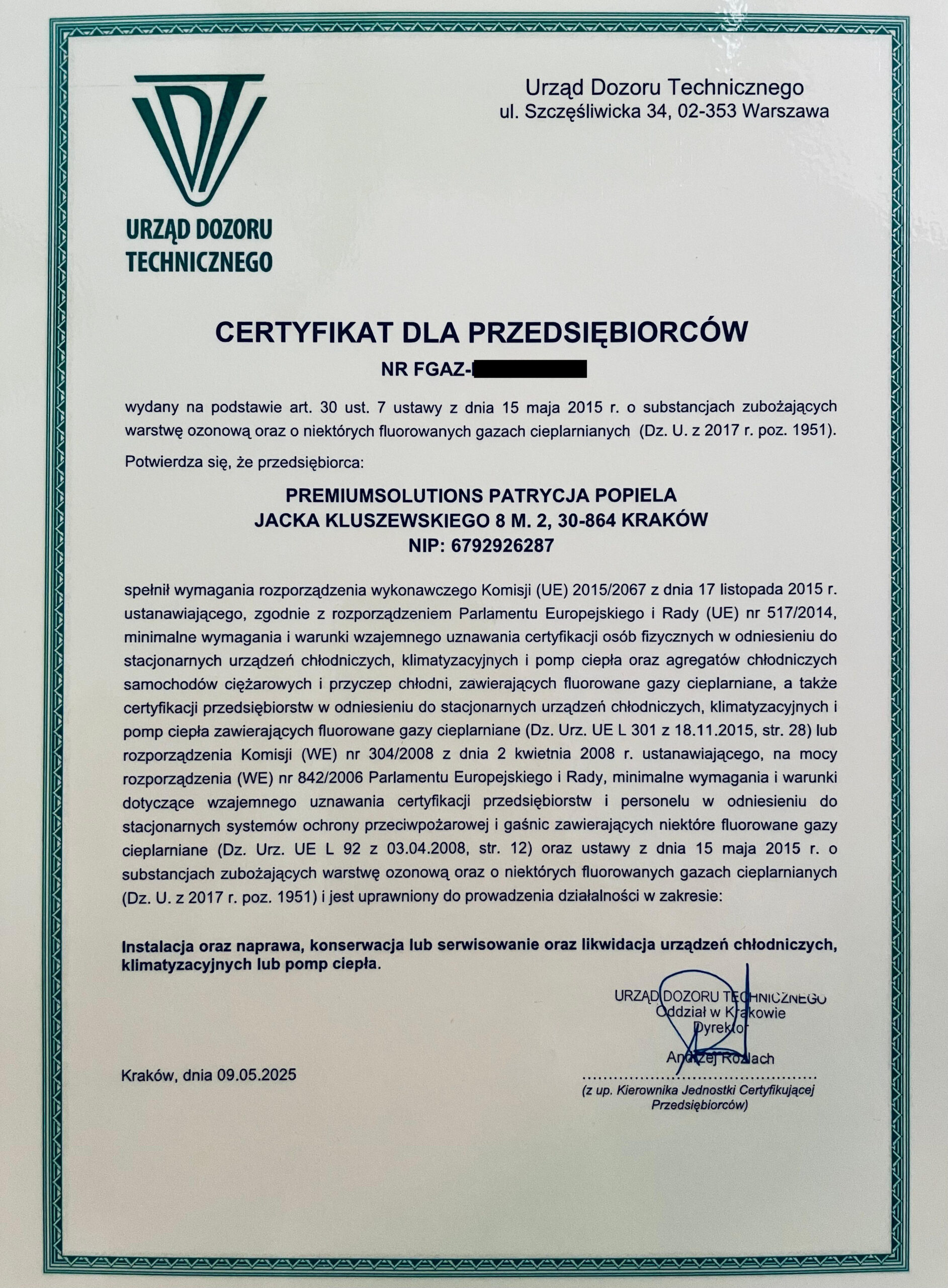Przedstawiamy Państwu certyfikat personalny oraz przedsiębiorcy wydane przez Urząd Dozoru Technicznego w Krakowie.
